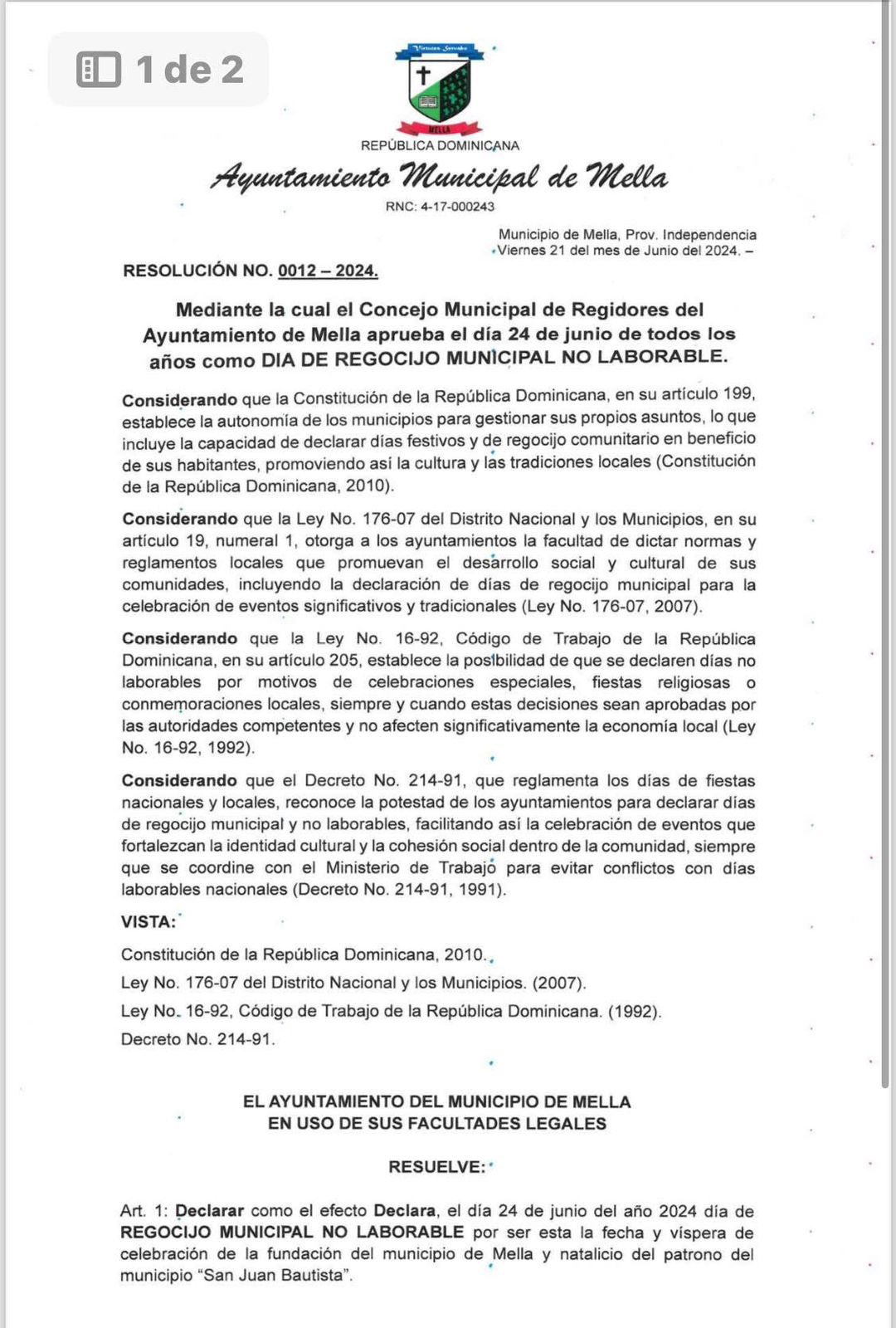 Aviso El Concejo de Regidores del Ayuntamiento de Mella declara el 24 de Junio de cada año como “Día de Regocijo Municipal No Laborable”.
